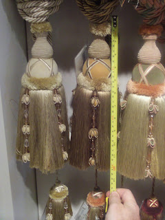 Comparing tassel heights between styles. First are American, second are French-style, made in California. Heights vary from a foot to fifteen inches. Dictionary.com defines a tassel as a pendent "consisting commonly of a bunch of threads, small cords, or other strands hanging from a roundish knob or head, used on clothing, in jewelry, on curtains, etc."